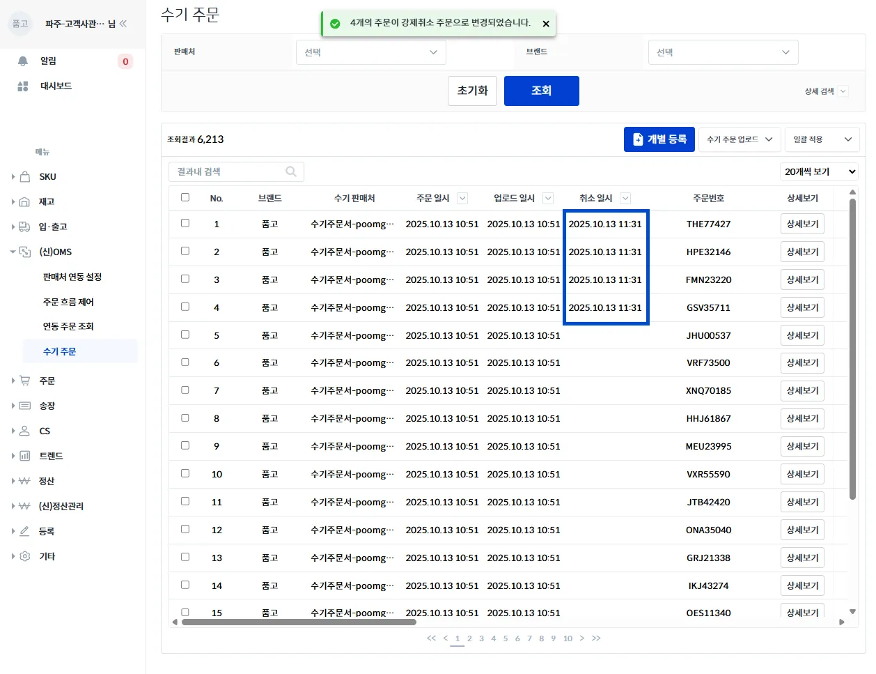 강제 취소된 주문 건은 수기 주문 화면에서 취소 일시가 입력되어있습니다.