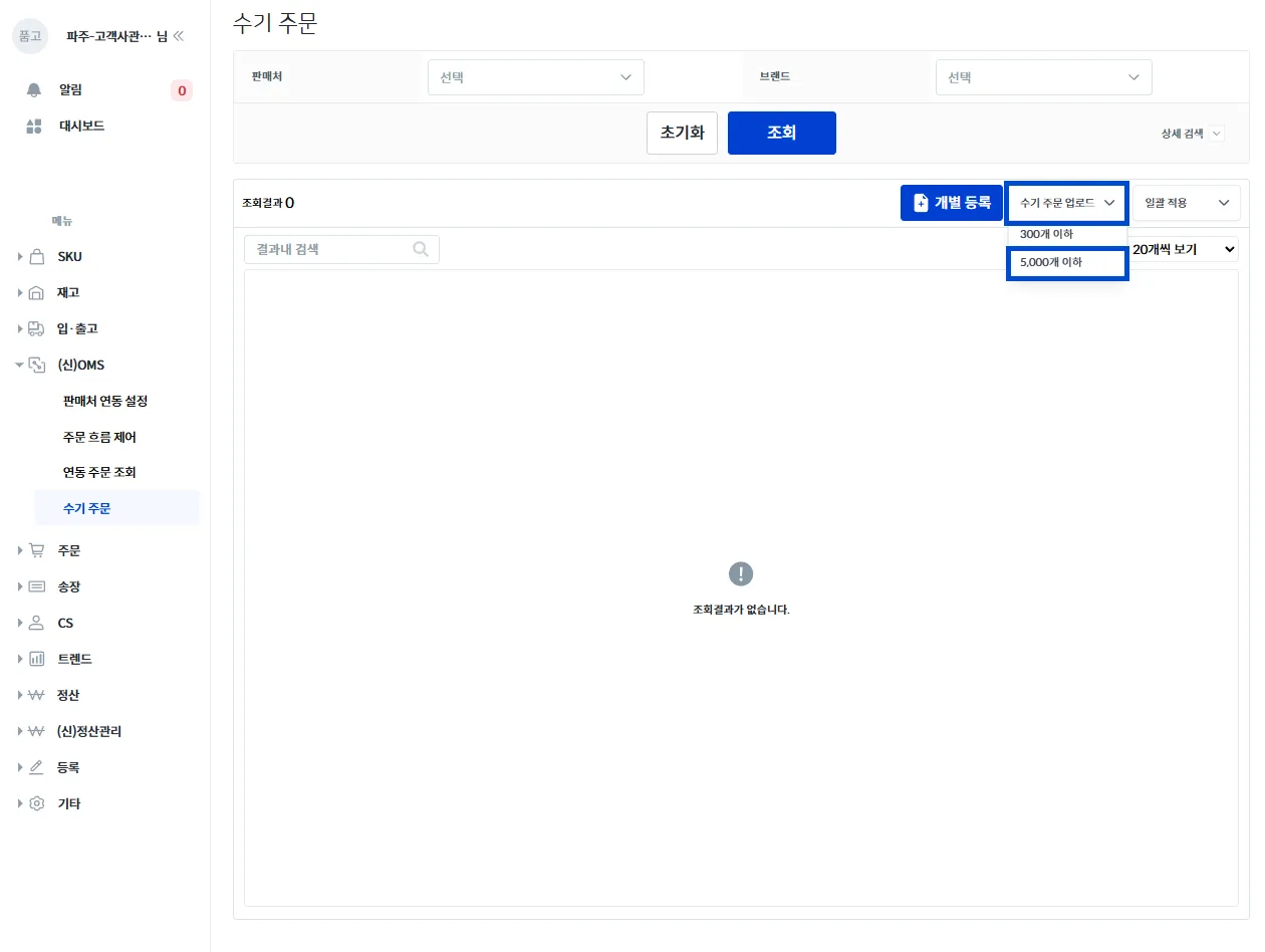 우측의 [수기 주문 업로드 → 5,000개 이하]를 클릭해 주세요.