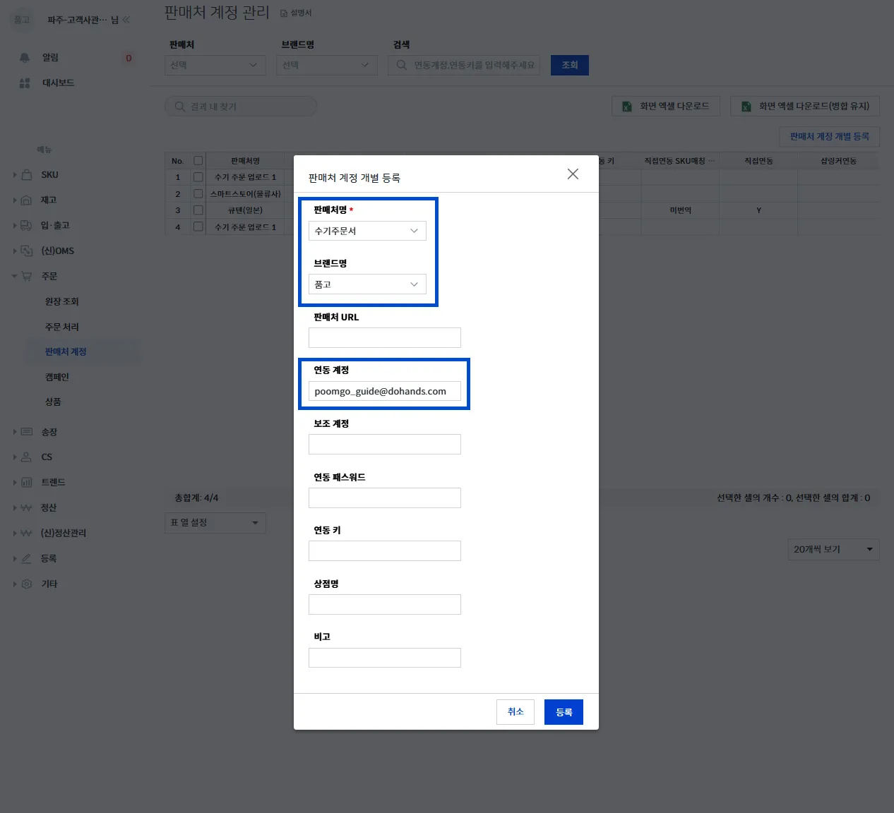 수기로 주문서를 업로드할 판매처(플랫폼), 브랜드, 연동 계정을 입력해 등록해 주세요.