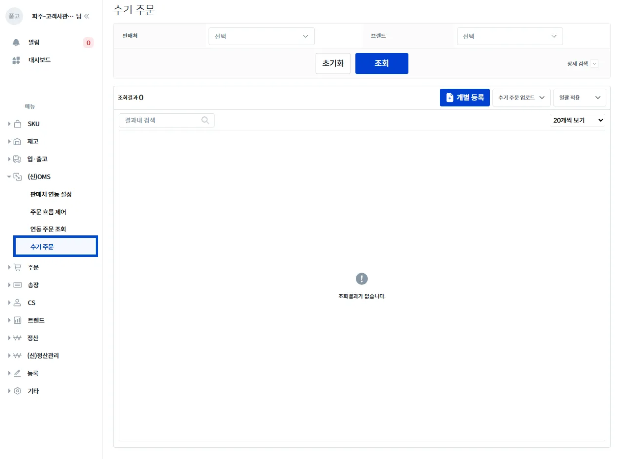 품고나우 좌측 (신)OMS → 수기 주문 메뉴 내 우측 상단에 있는 ‘개별 등록’ 버튼을 클릭해주세요.