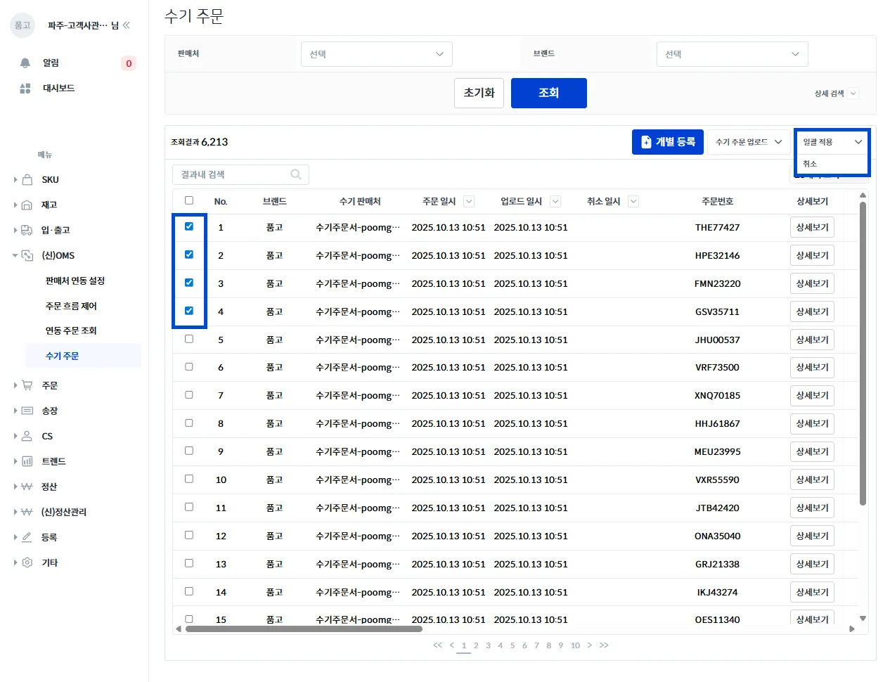 [(신)OMS → 수기 주문] 화면에서 취소를 원하는 주문 건을 체크하고 취소 버튼을 선택합니다.