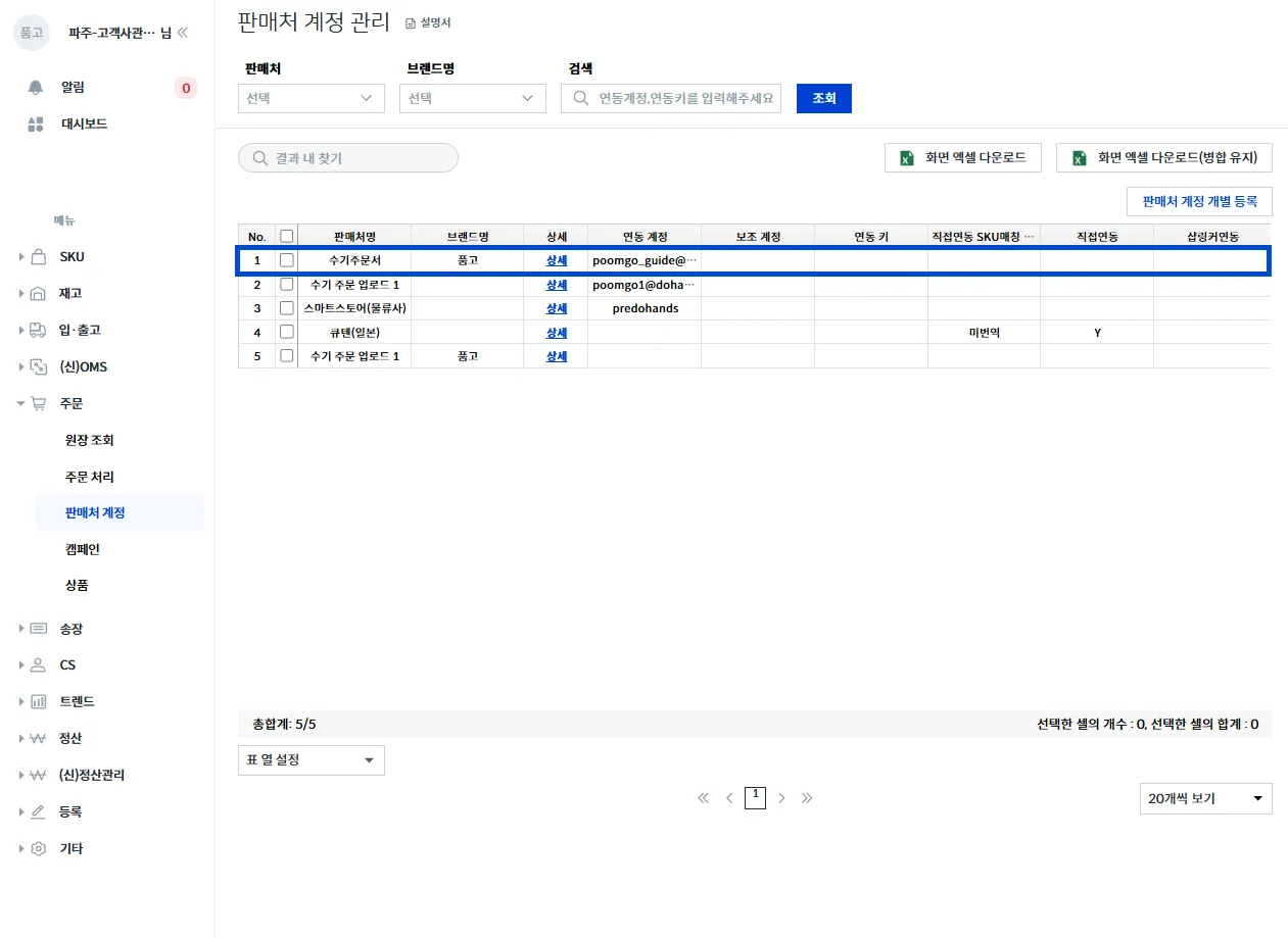 등록이 완료되면, 등록한 판매처 계정이 목록에 표시됩니다.