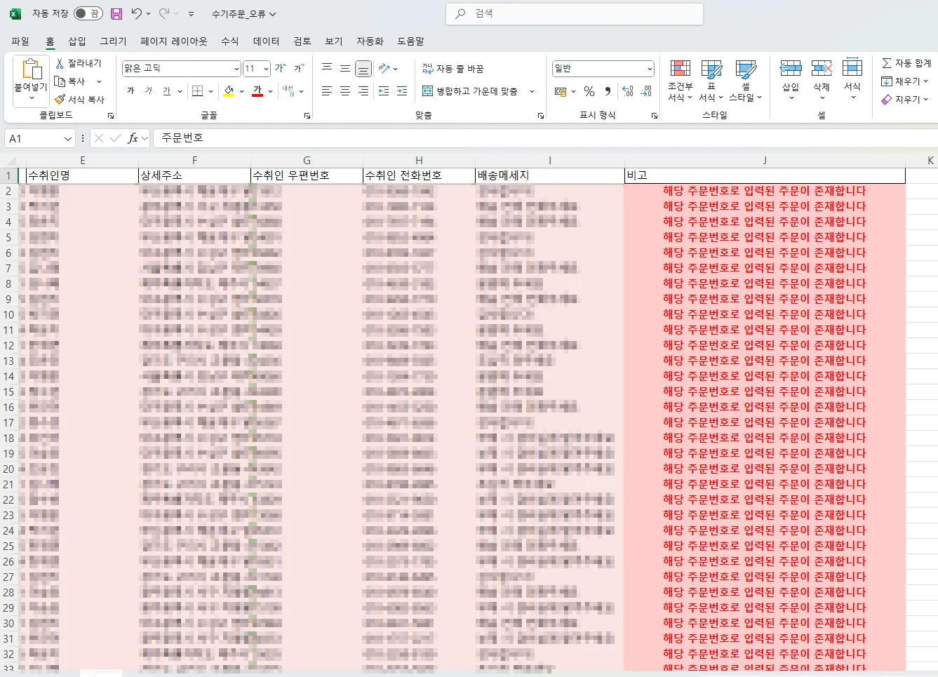 오류 주문만 수정 후 해당 파일을 재업로드하면 되며, 오류가 없던 그룹은 정상 반영됩니다