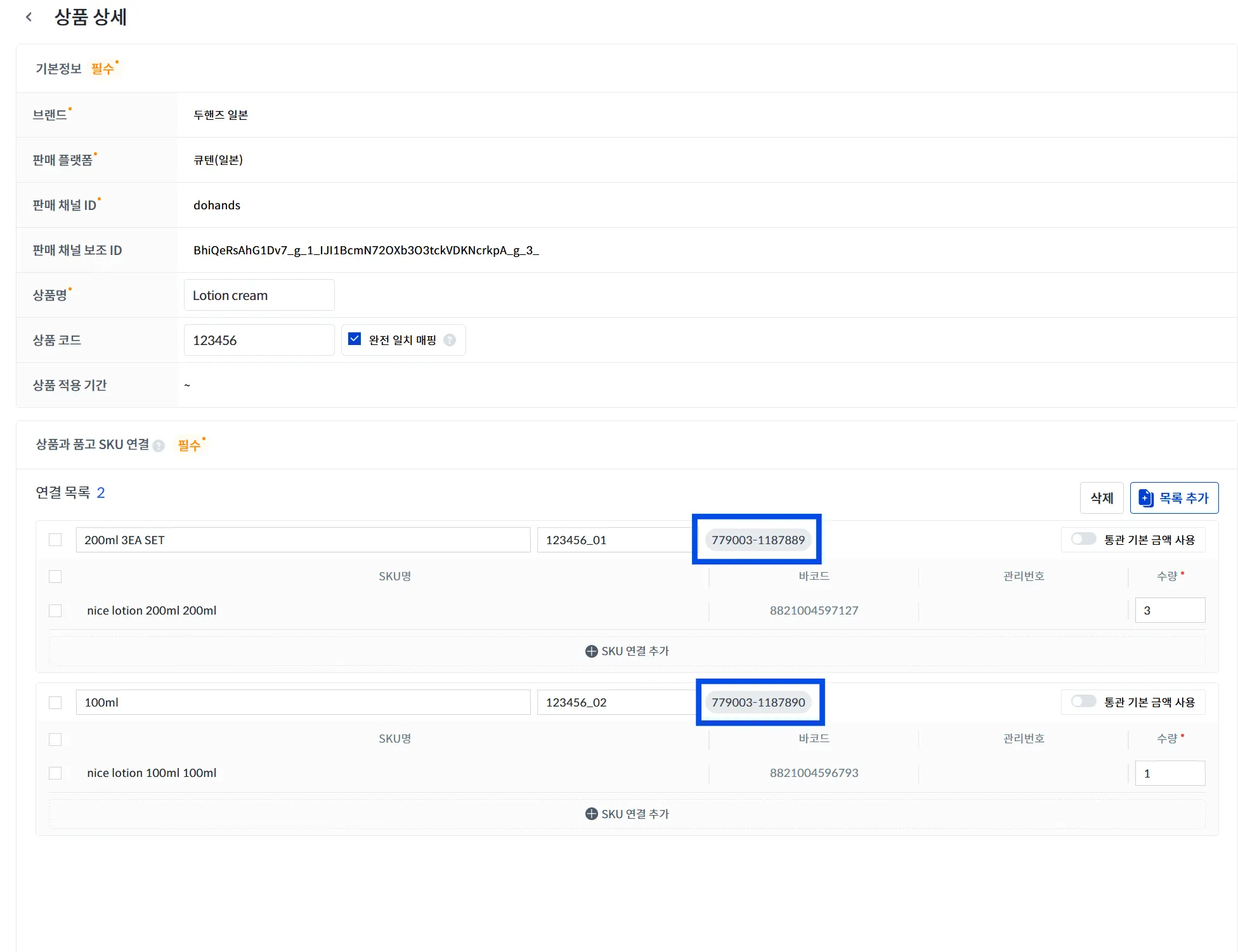 [상품관리 - 韓ダッシュ(칸닷슈) 관리] → 韓ダッシュ(칸닷슈) SKU 연결