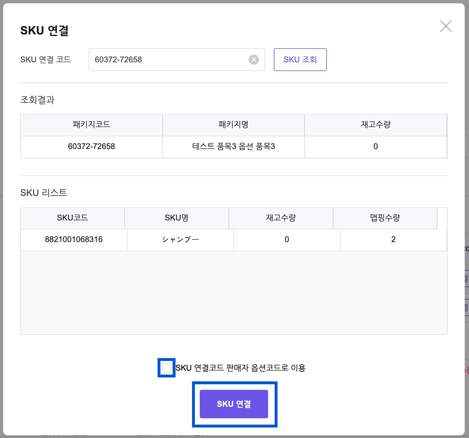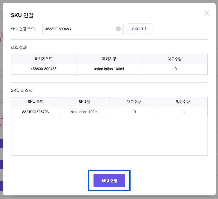 SKU 연결 코드에 연결해야하는 상품에 있는 패키지코드(품고관리코드) 를 입력해 주세요.
