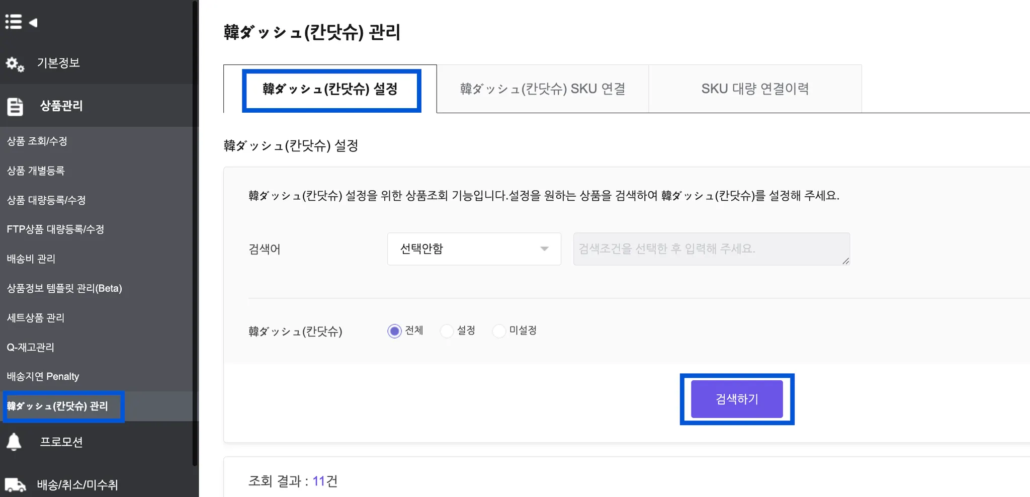 [韓ダッシュ(칸닷슈) SKU 연결] - [검색하기]를 선택해 주세요.