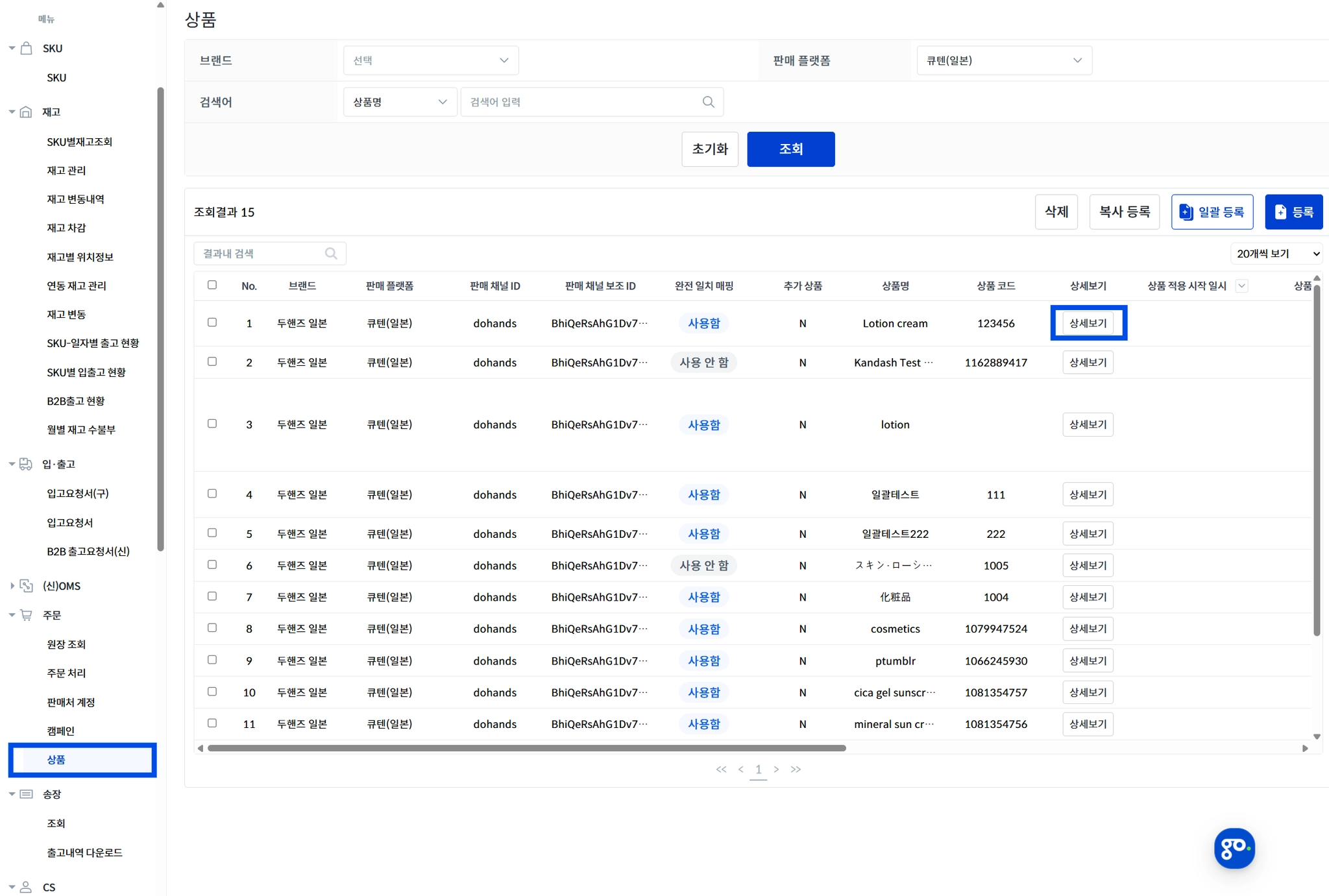[SKU 조회]를 선택해 주세요.