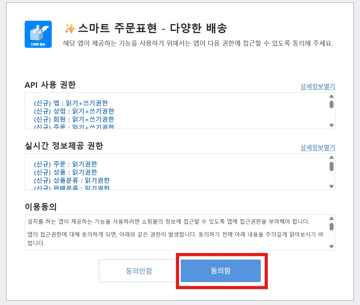 API 사용 권한, 실시간 정보제공 권한, 이용동의를 확인 후 ‘