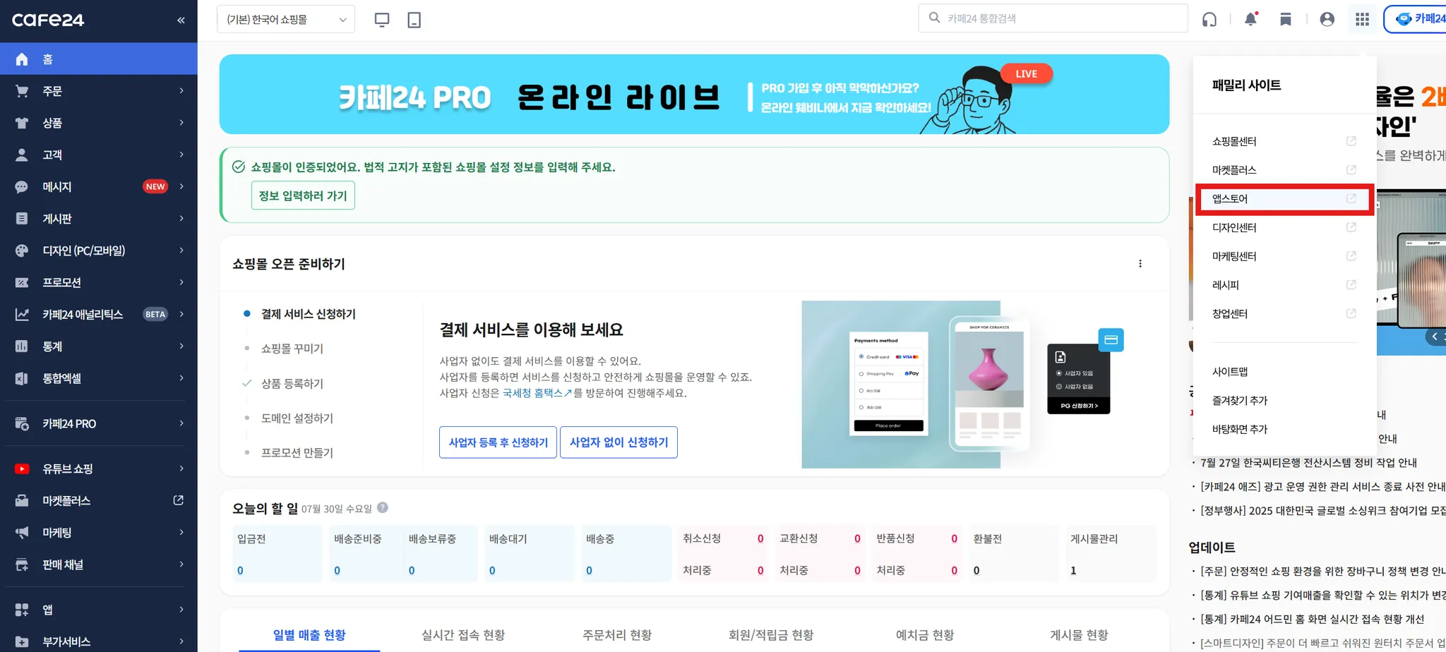 우측 상단 ‘패밀리 사이트’에서 ‘앱스토어’를 클릭해 주세요.