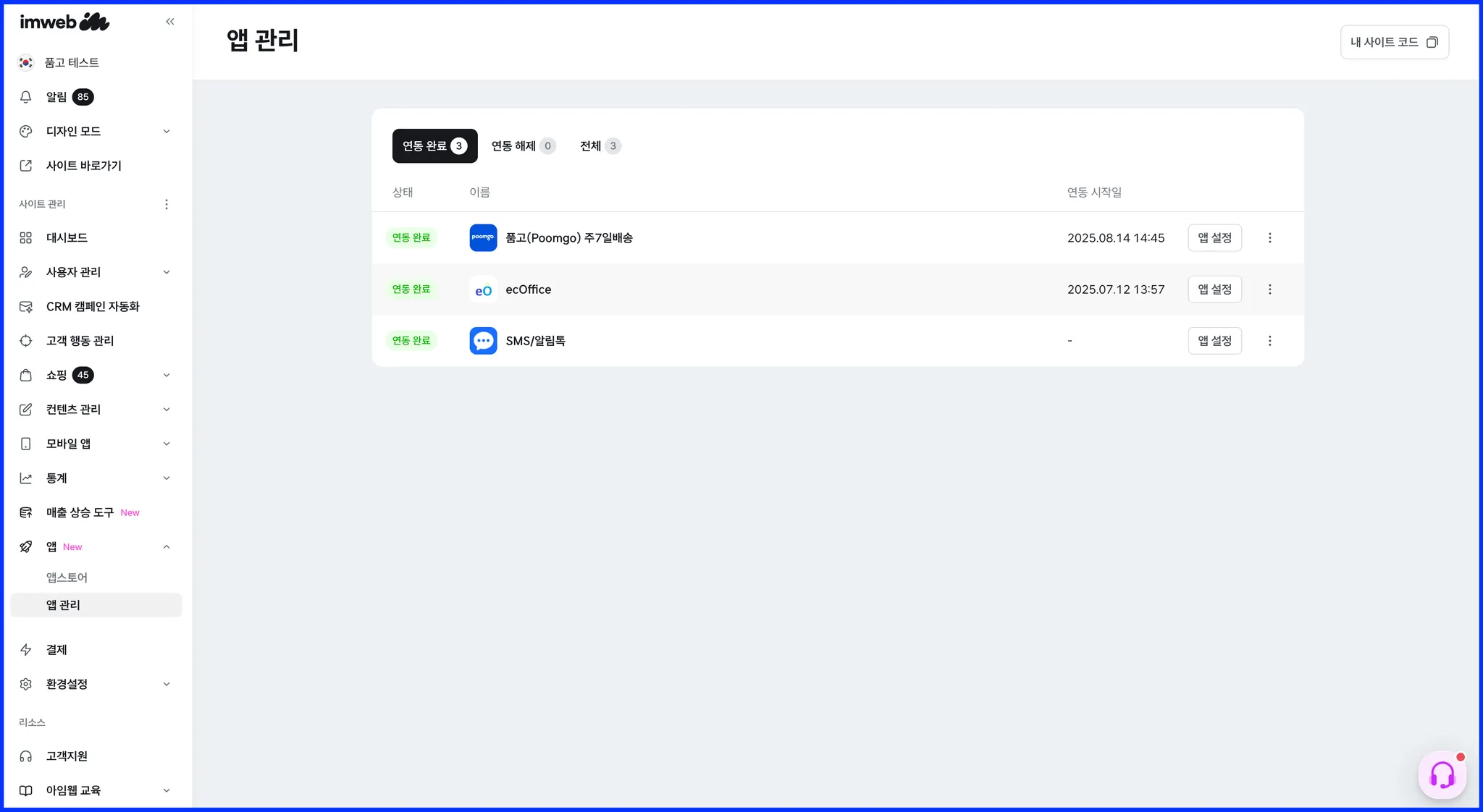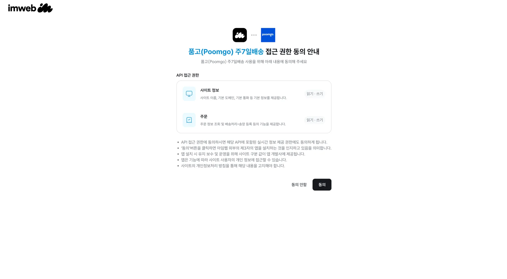아임웹 관리 페이지에서 ‘앱’ → ‘앱 관리’ 메뉴에서 품고(Poomgo) 주7일배송 연동 완료를 확인해 주세요.