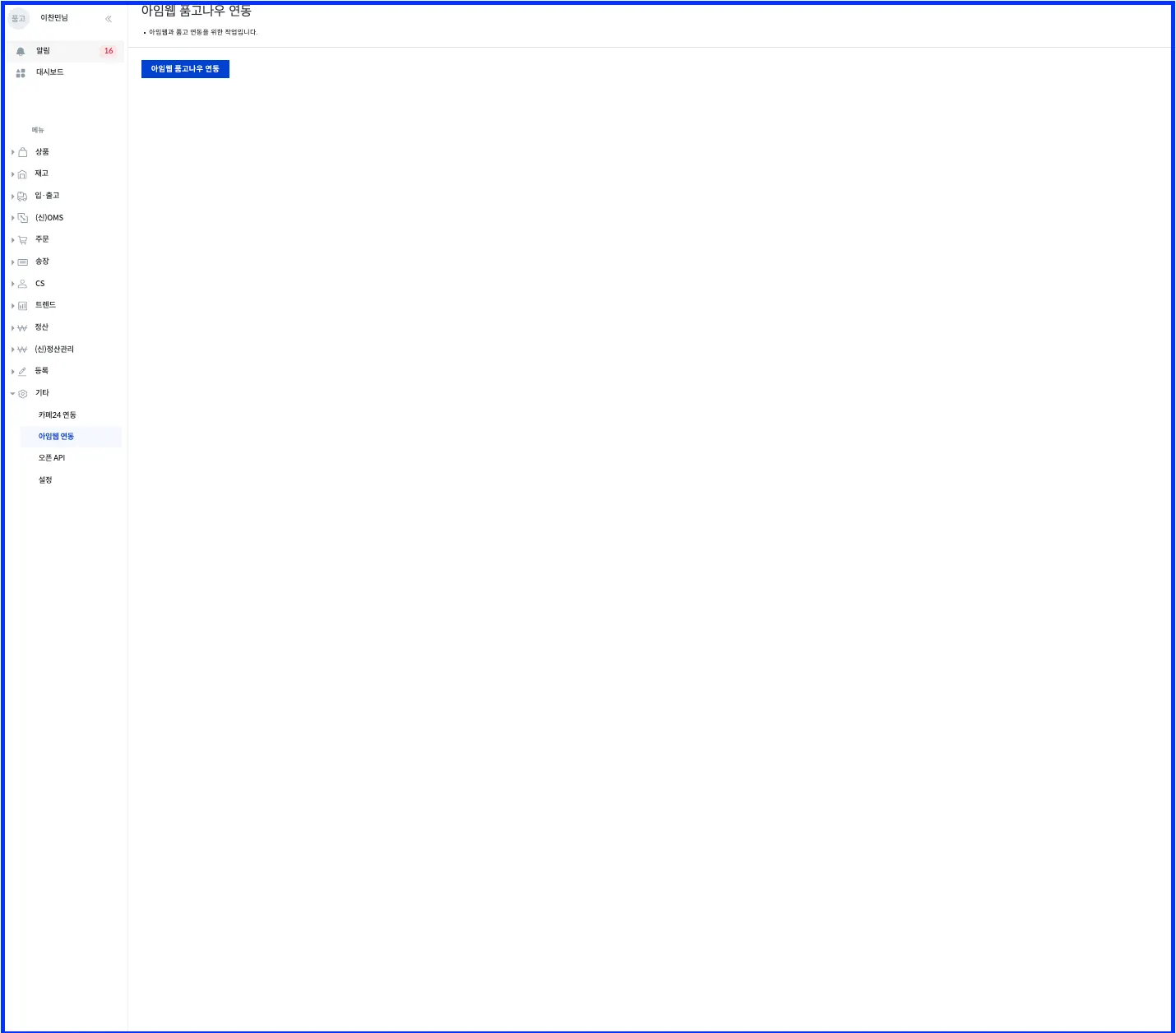우측에 ‘판매처 계정 개별 등록’ 클릭 후 판매처 ‘아임웹’ 검색 후 저장해 주세요.