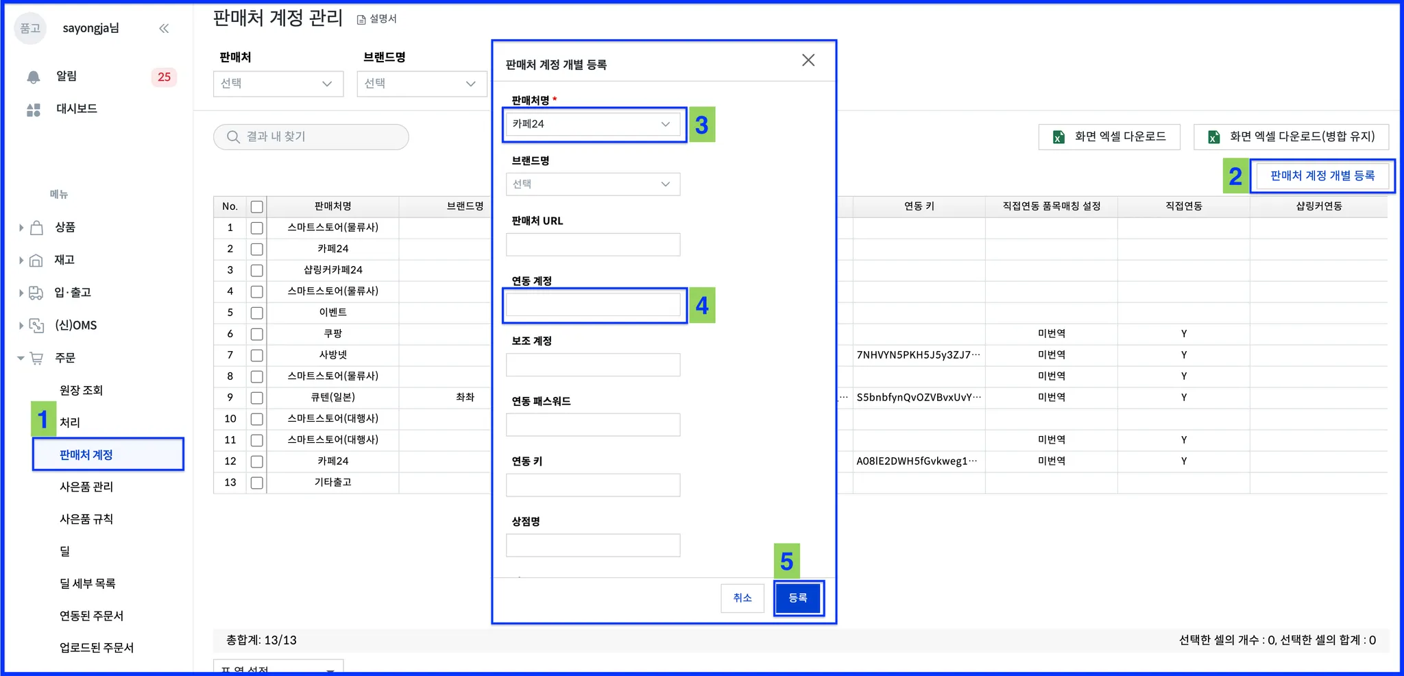 주문 > 판매처 계정 > 판매처 계정 개별 등록 > 판매처명(카페24) > 연동계정(카페24 대표운영자ID) > 등록