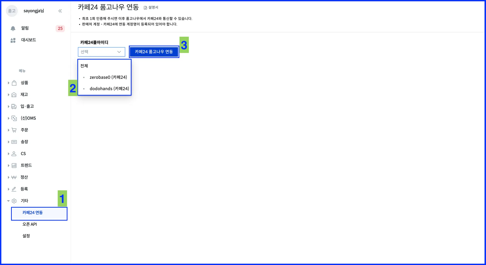 판매처 생성 및 연동 설정 후, 품고에 계정 정보 공유