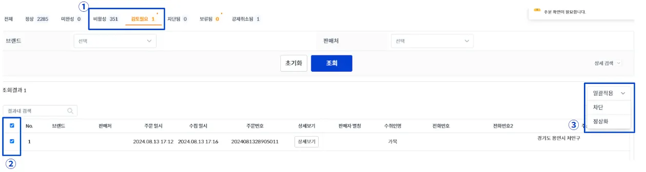 ⑤ 이전에 설정한 조건에 맞게 테스트 주문이 검토필요 또는 정상 주문으로 구분되는 지 확인합니다.