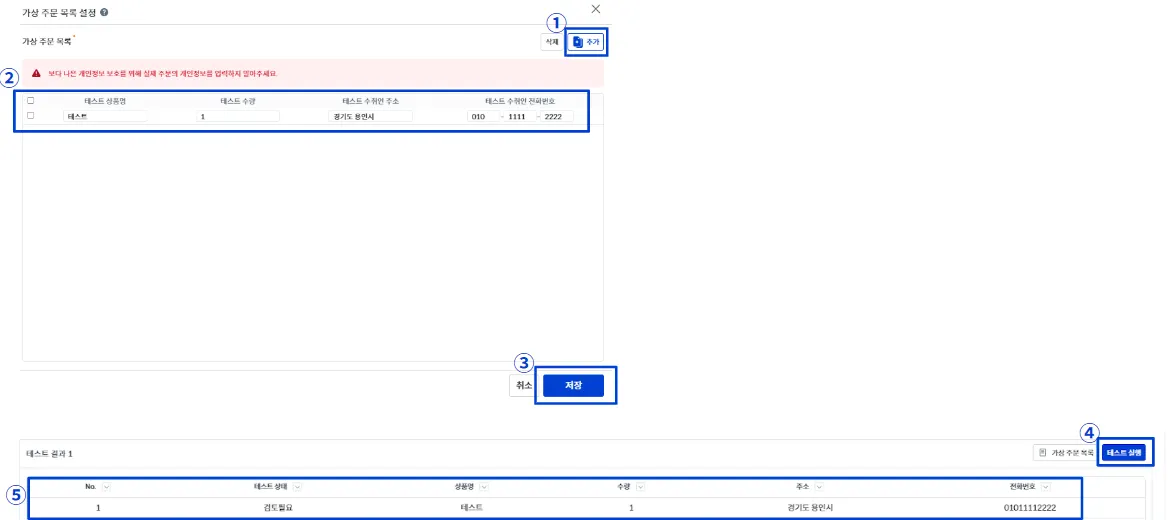 ② 가상 주문에 상품명, 수량, 주소(조건에 추가했던 주소지 포함된 경우와 아닌 경우)를 입력합니다.