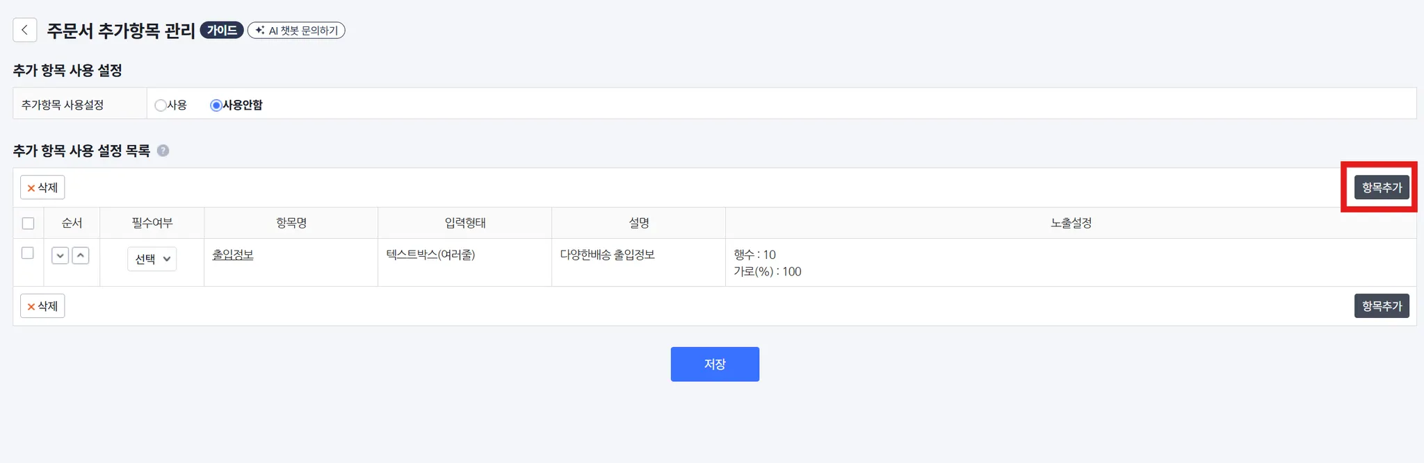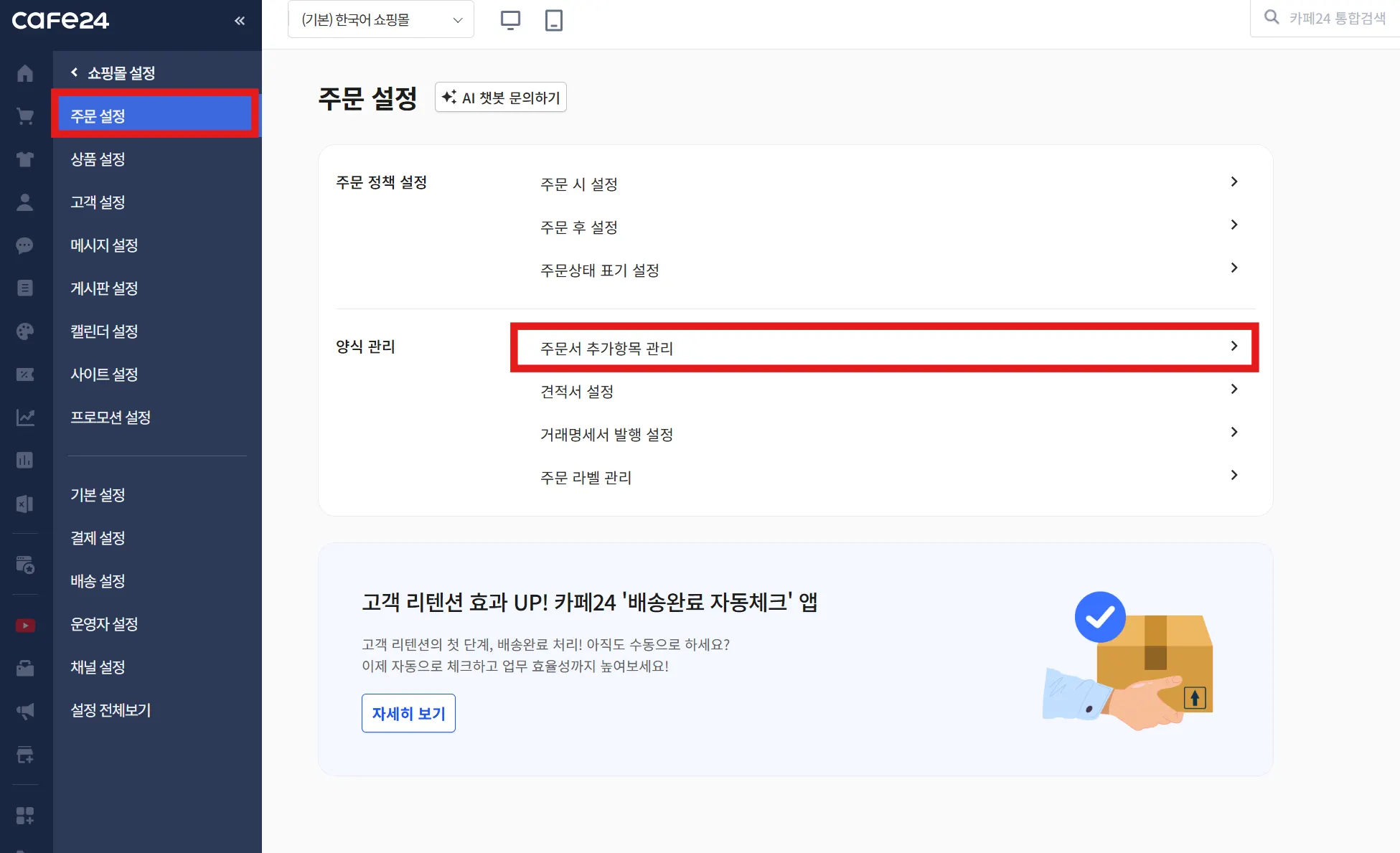 ‘주문 설정’ → ‘주문서 추가항목 관리’를 클릭해 주세요.
