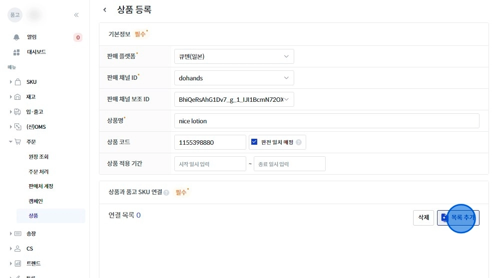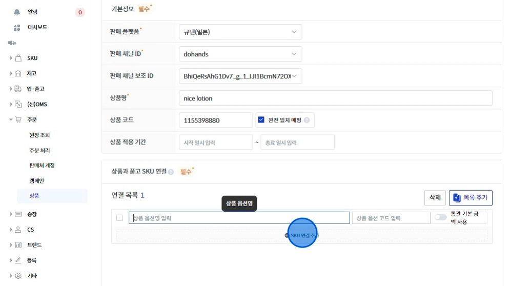 [SKU 연결 추가]를 눌러 출고될 품목을 선택해 주세요.