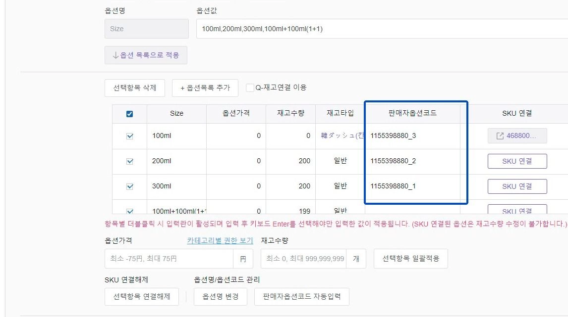 상품 옵션 코드 입력법
