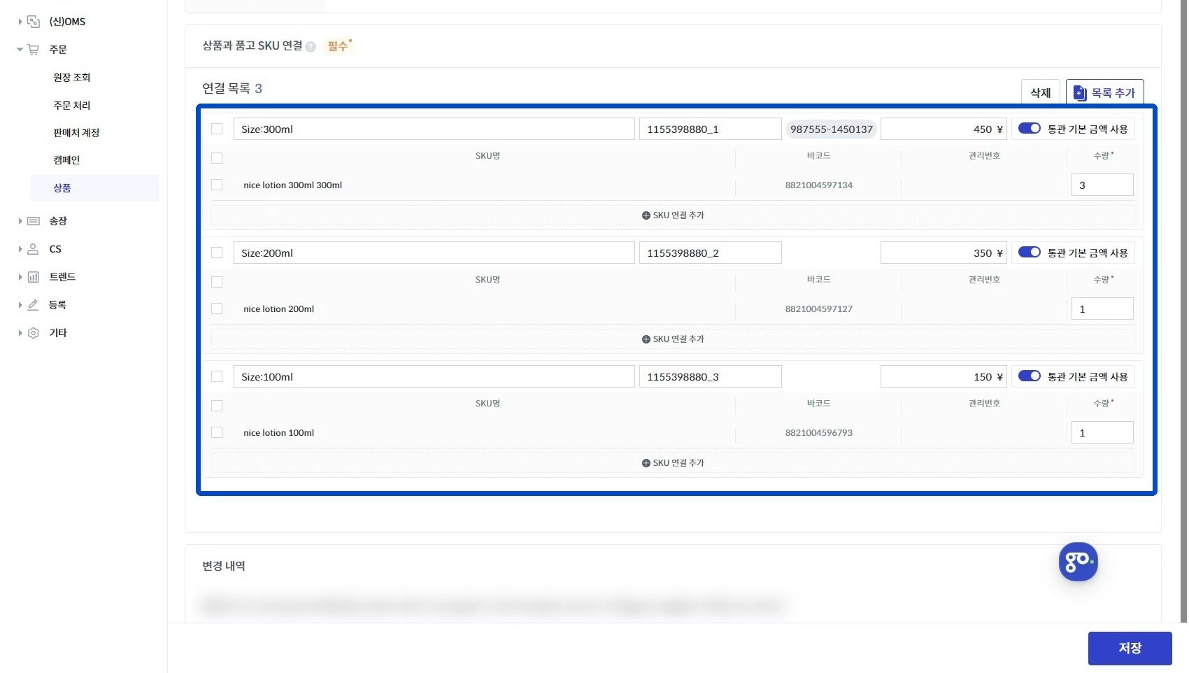 통관 기본 금액 사용 | 상품이 등록되고, 각 상품을 클릭하여 통관 기본 금액 사용을 모두 켜주셔야 이후에 오류가 나지 않습니다. |