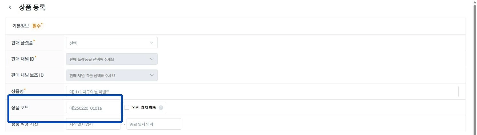 등록되는 상품은 기본적으로 [상품 코드]로 우선 매핑 되도록 설정되어 있습니다.