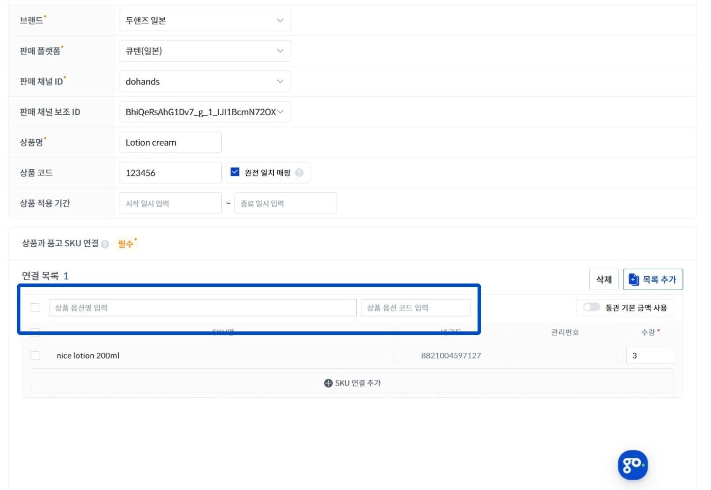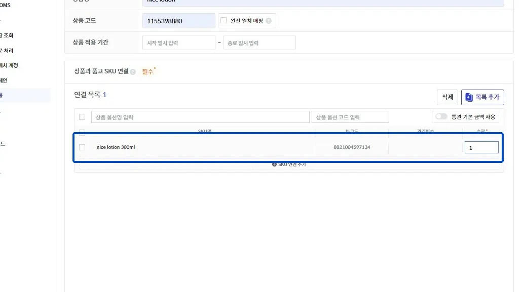 옵션이 있는 경우 [목록 추가]를 눌러 다른 옵션을 추가하고, SKU를 선택하여 연결해 주세요.