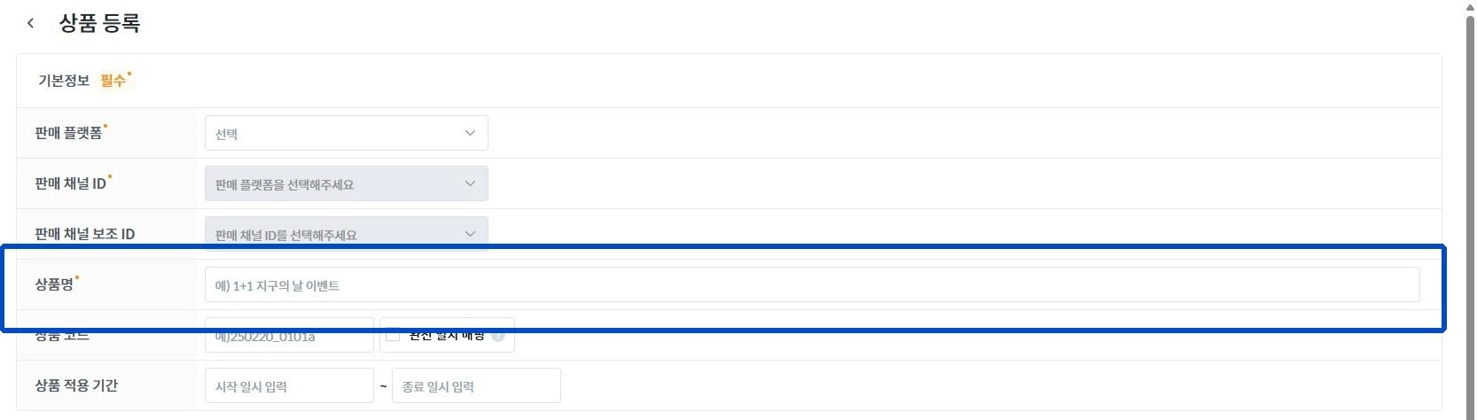 기본정보의 [브랜드]를 선택 후 [판매 플랫폼], [판매 채널 ID]를 선택해 주세요.