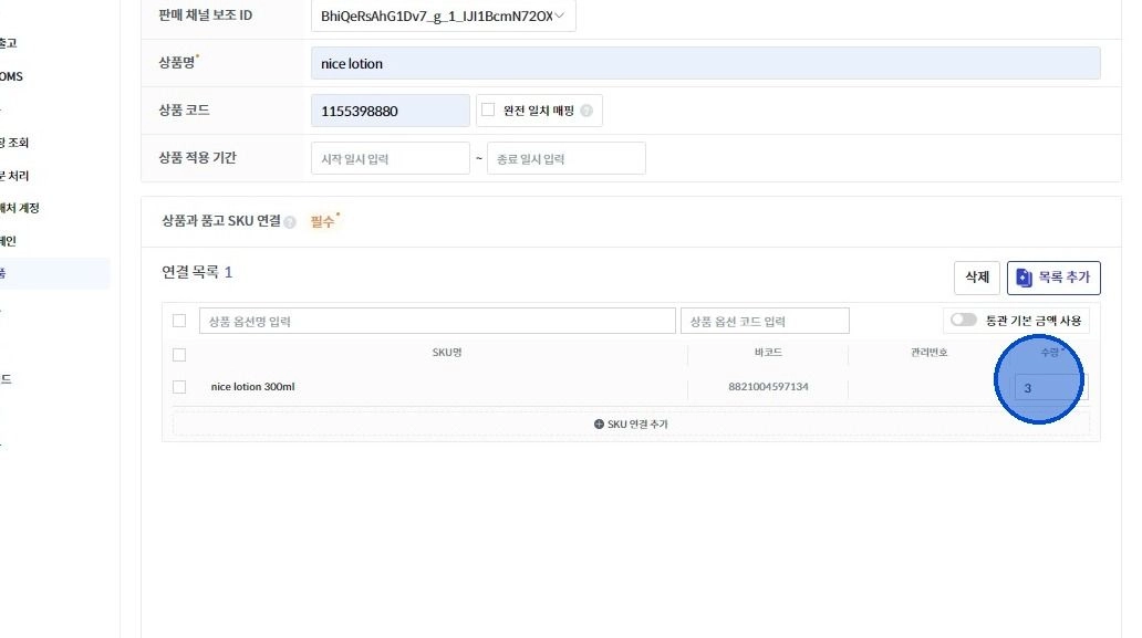 예시) 아래 이미지 기준으로 주문 1건 당 nice lotion 300ml 3개 출고 진행