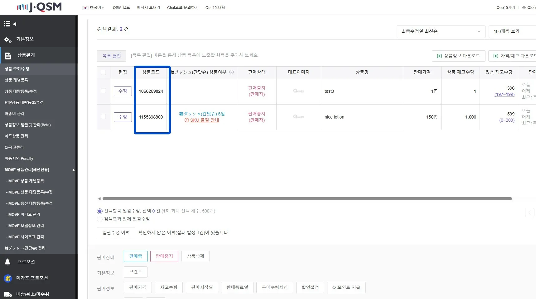 상품 코드는 QSM에 등록되어 있는 상품 코드를 입력해주세요.