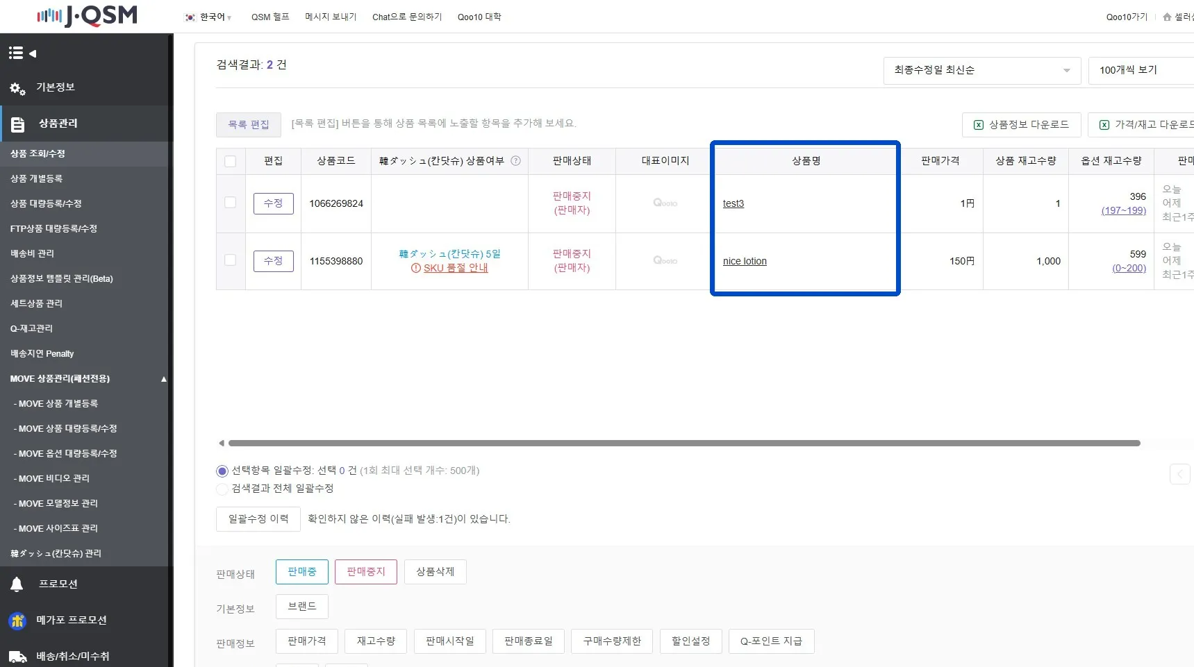 상품명을 QSM의 상품명과 동일하게 입력해 주세요.