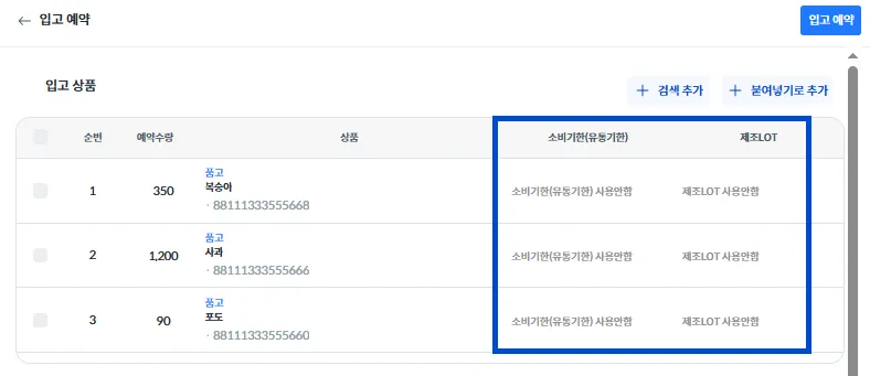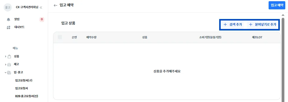 입고 상품 옆 [ + 검색 추가]를 눌러 상품을 추가해 주세요.