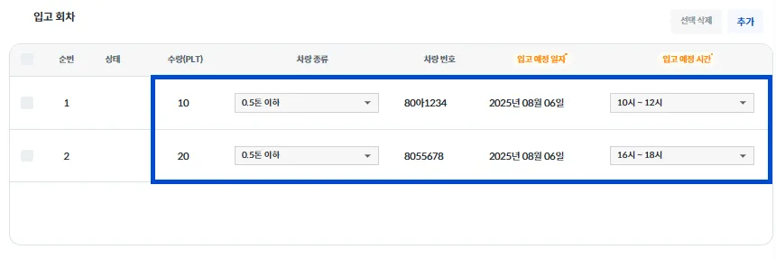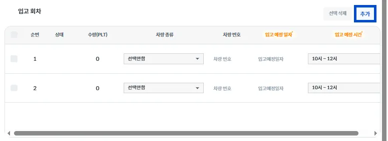 입고 회차별로 [PLT 수량 / 차량 종류 / 차량 번호 / 입고 예정 일자 / 입고 예정 시간]을 입력해 주세요.