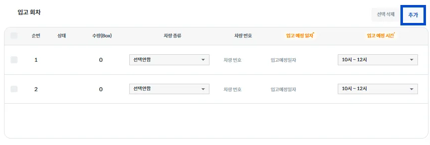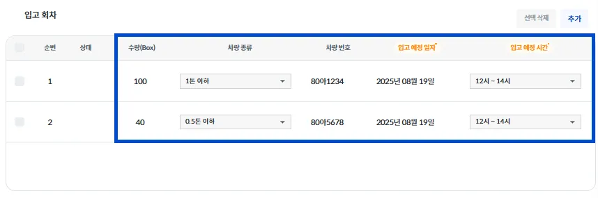 입고 회차별로 [BOX 수량 / 차량 종류 / 차량 번호 / 입고 예정 일자 / 입고 예정 시간]을 입력해 주세요.