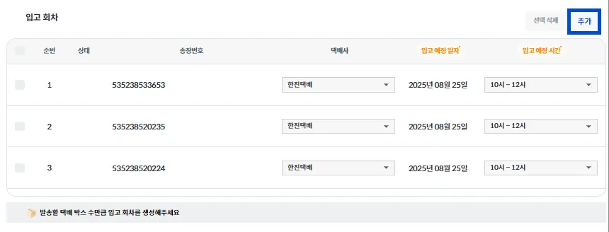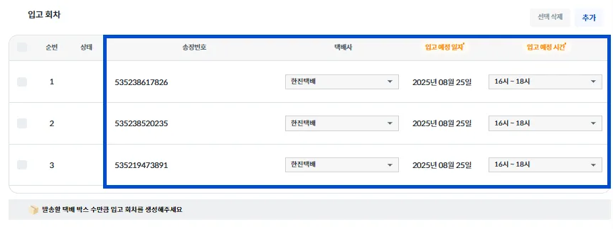 입고 회차별 [송장 번호 / 택배사 / 입고 예정 일자 / 입고 예정 시간]을 작성해 주세요.