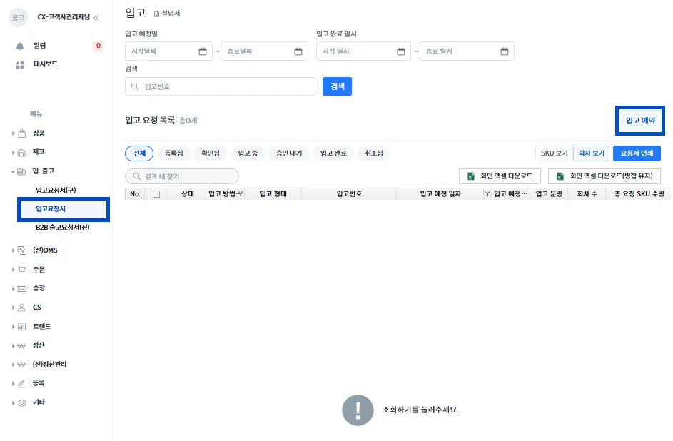 품고나우 좌측 [입·출고 → 입고 요청서]를 클릭 후 [입고 예약]을 눌러 주세요.