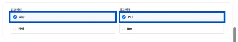 입고 방법에 [차량] / 입고 형태에 [PLT]를 선택해 주세요.