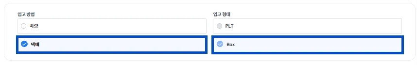 입고 방법에 [차량] / 입고 형태에 [BOX]를 선택해 주세요.