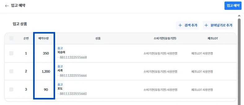 상품 추가 후 [예약 수량]의 1을 클릭하여 입고할 상품의 낱개 수량을 입력해 주세요.