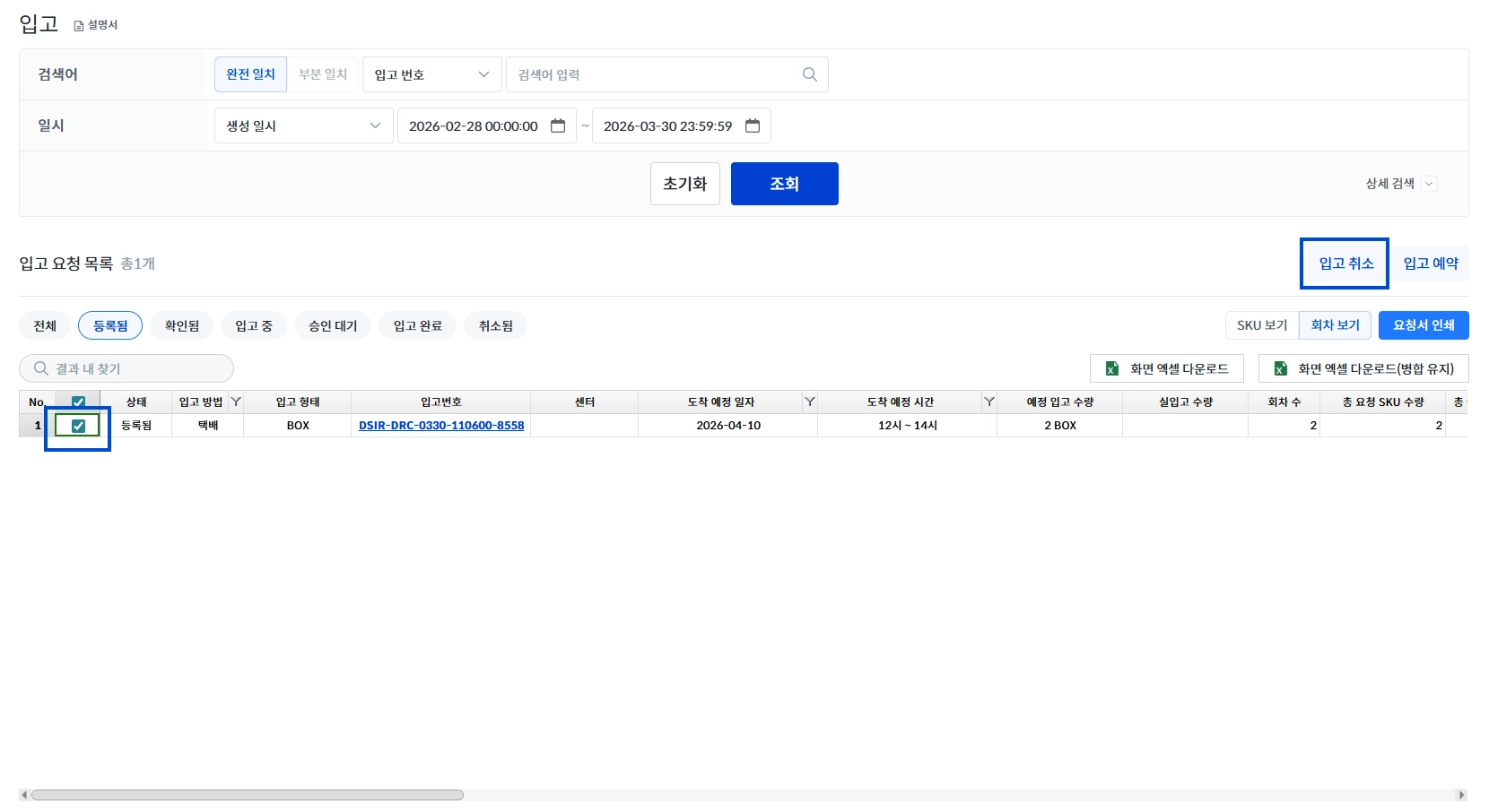 [등록됨]탭에서 취소하려는 입고번호를 체크 후 [입고 취소] 눌러주세요.