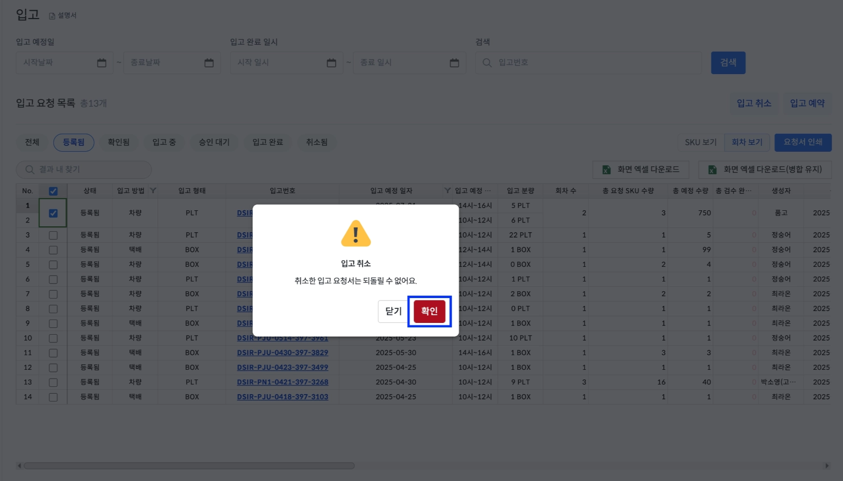 취소한 입고 요청서는 이전 상태로 되돌릴 수 없습니다. [등록됨] 상태에서만 [입고 취소] 가능합니다.