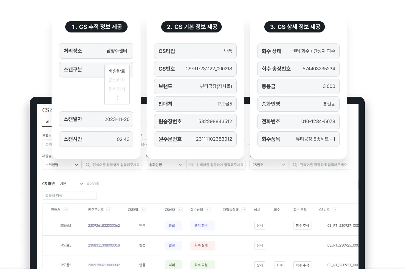 주문 데이터는 물론 고객 클레임(취소/교환/반품)까지 자동 수집해 시스템 상 고객의 불편 사항을 빠르게 해결할 수 있답니다. 항상 10~20% 가량 발생하는 반품 건은 전산 상에서 자동으로 접수되고, 반품/재배송/교환의 처리 상태를 실시간으로 확인할 수 있어요. 주문 취소 건 또한 판매처에 자동 반영되기 때문에 CS처리에 드는 에너지를 줄일 수 있답니다.