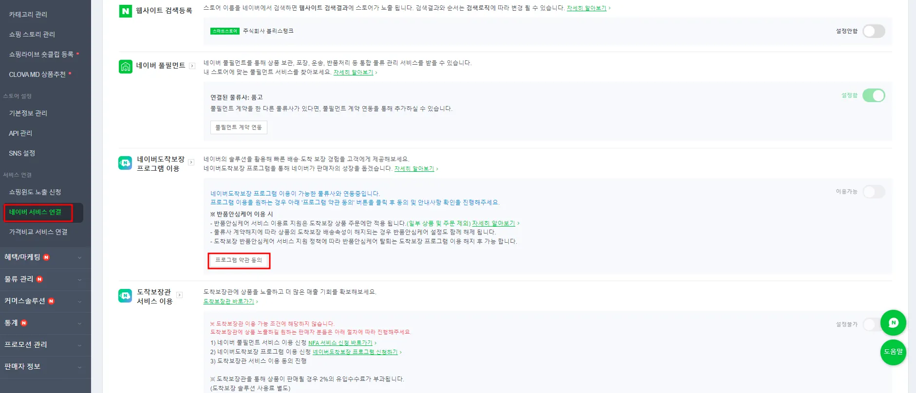 스마트스토어 - 스토어관리 - 네이버 서비스 연결에서 네이버도착보장 프로그램 이용의 프로그램 약관 동의 진행해주세요!