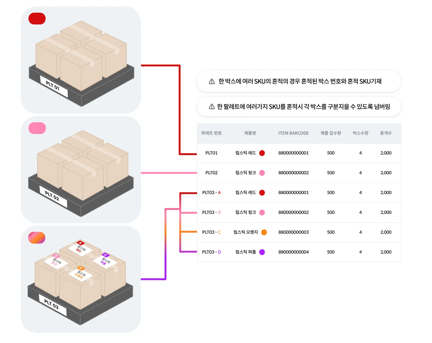 1박스에는 1SKU만 포장되어야 하며, 1PLT에는 1SKU만 적재되어야 합니다.