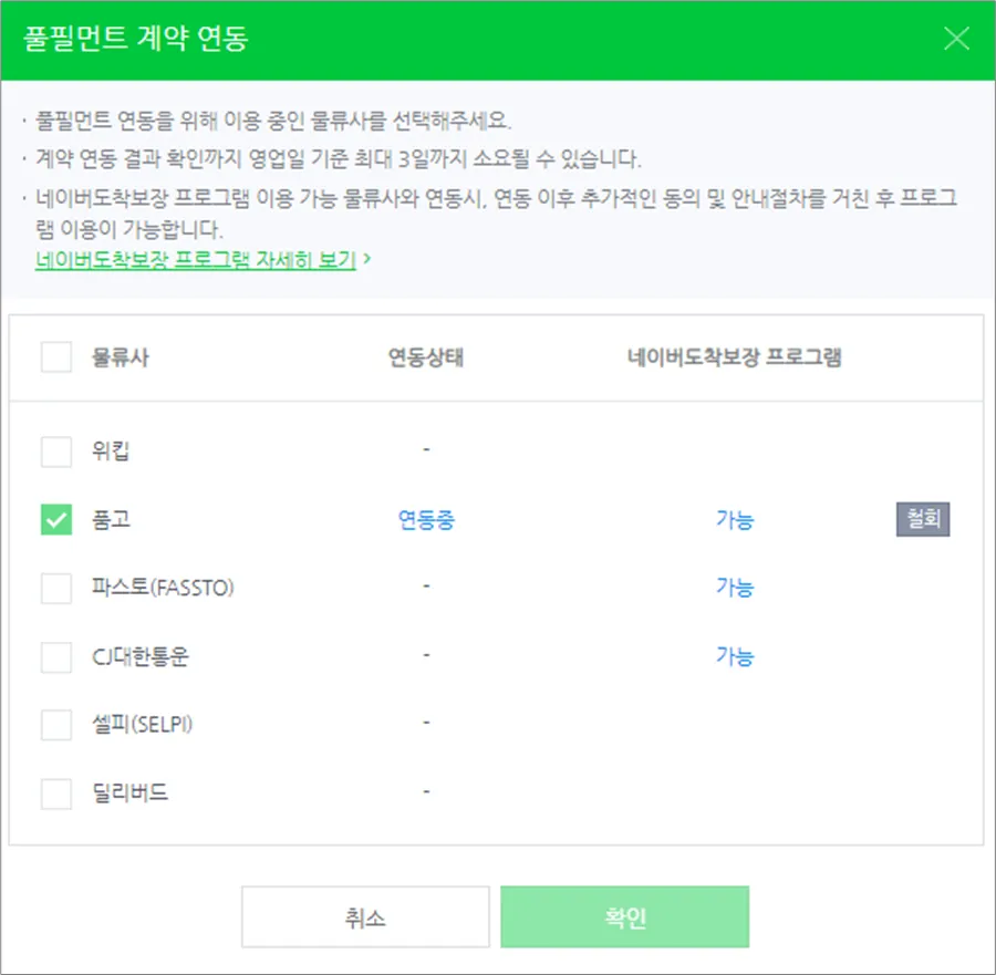먼저, 스마트스토어>노출관리>노출서비스관리>[풀필먼트 계약연동]에서 ‘연동중’ 상태인지 확인해주세요.