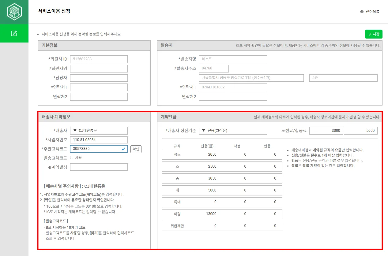 이형 | 계약서 내 유첨 3. 요율표 2 (국내 배송 서비스)의 단가를 확인하여 입력해 주세요. |