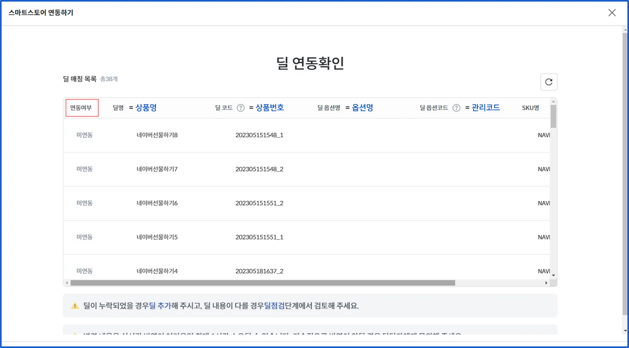 조회 시, 딜 옵션코드(스마트스토어 관리코드)가 중복 등록되어 있다면,