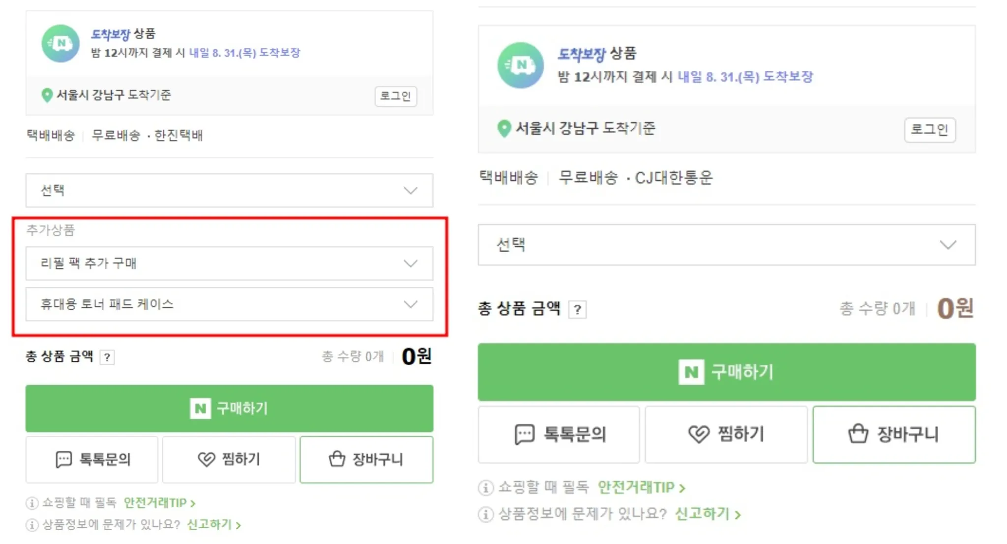 [참고] (왼쪽) 옵션과 추가상품이 있는 상품 (오른쪽) 옵션만 있고, 추가상품은 없는 상품