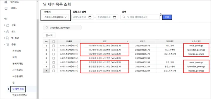품절 상태로 노출되는 옵션의 딜 옵션 코드(스마트스토어 관리코드)를 품고 나우 > 주문 > 딜 세부 목록에서 검색해 보세요.