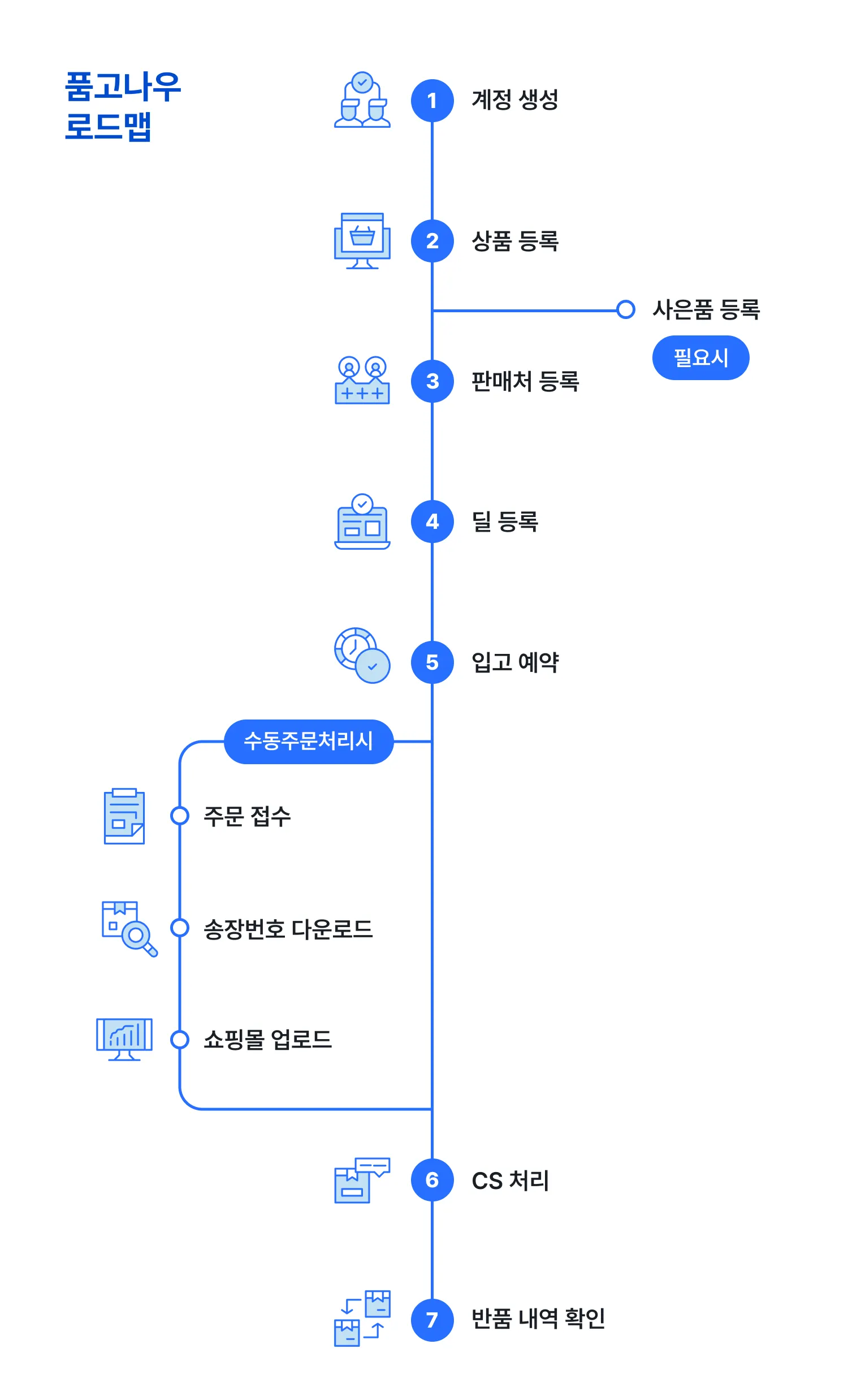 품고나우의 주요기능 가이드입니다. 상품, 입고, 주문(딜)관리, 자동주문연동, 송장, 사은품, CS처리, 데이터에 대한 가이드를 확인할 수 있습니다.