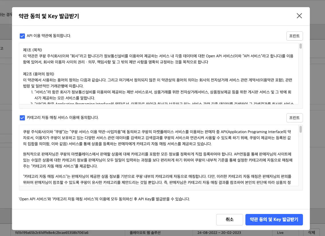 약관 동의 후, 약관 동의 및 Key 발급받기 클릭