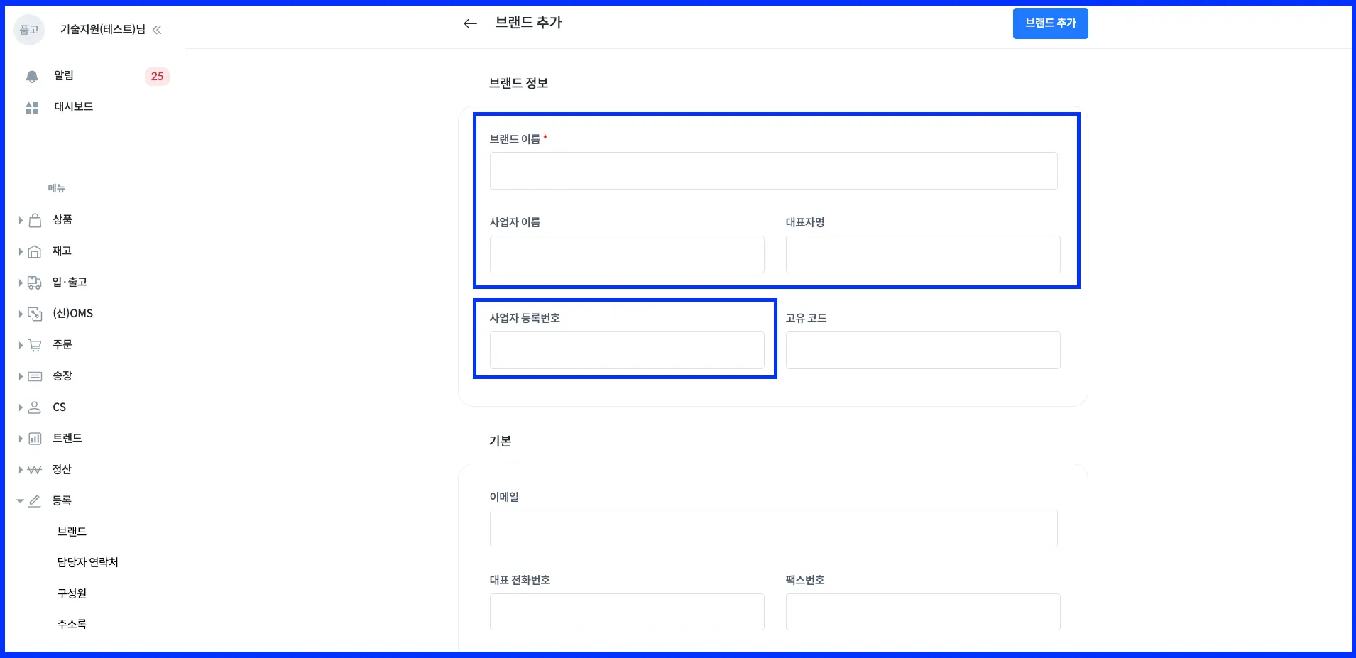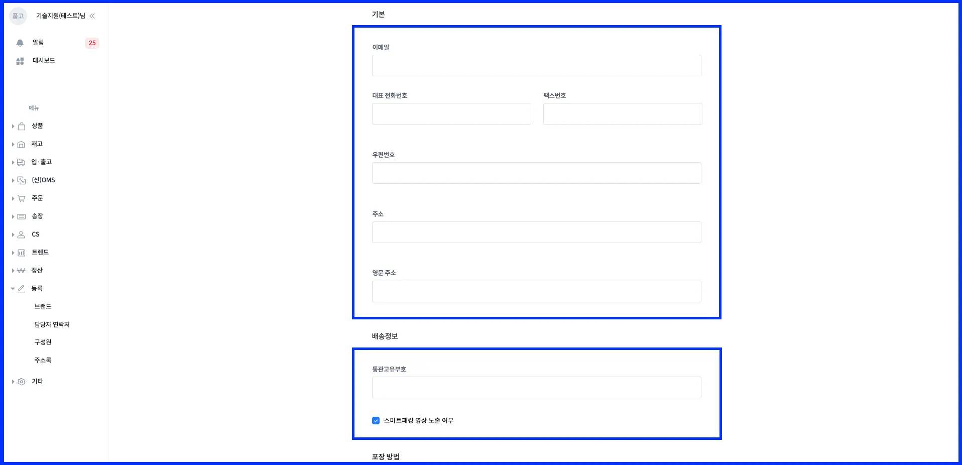 기본 정보 입력→이메일,대표전화번호,팩스번호,우편번호, 주소, 영문주소